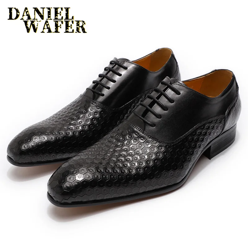 LUXURY BRAND MEN LEATHER SHOES GEOMETRIC PRINTS MEN OFFICE WEDDING FORMAL SHOES BLACK BROWN LACE UP
